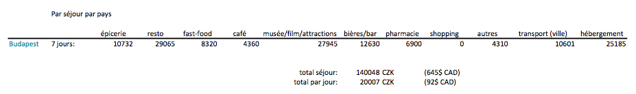 Pour ces 7 journées bien remplies en victuailles et en activités, ça nous a couté la modique somme de 650$ CAD pour deux. Vive l’Europe de l’Est! Comme à chaque destination, voici le détail de nos dépenses pour vous donnez une petite idée (coût pour 2 personnes toujours):