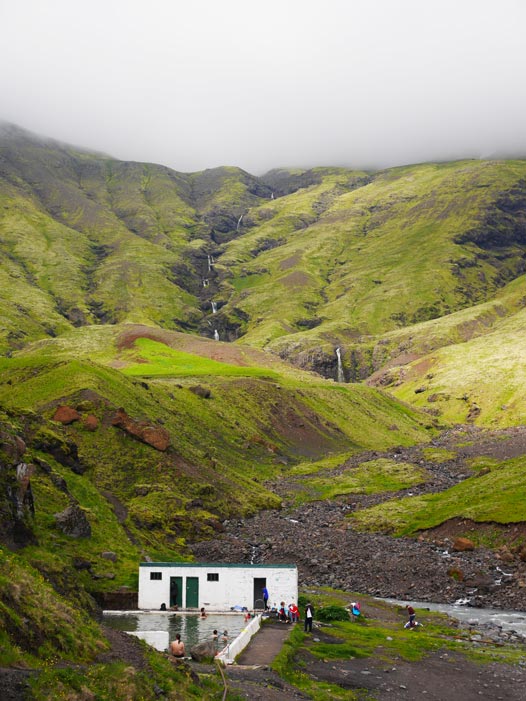 Fraîchement débarqués de l’aéroport, derrière le volant de notre Kuku Camper manuel, du Sigur Rós en trame de fond, nous voilà en route pour se la couler douce au Blue Lagoon, le spa le plus réputé d’Islande. Même pas besoin de carte, tu suis l’odeur du soufre (ou plus familièrement l’odeur de pet) et voilà! Pour un gros 40 €, tu peux te baigner toute la journée dans un gros bain fait en roche volcanique, rempli d’eau chauffée à l’énergie géothermique qui ressemble étrangement à du lait… mais bleu. Bref, super touristique, mais un must malgré tout. Surtout quand tu viens de te taper 5h de vol (et que le site est à 20 minutes de l’aéroport). Par la suite, nous nous sommes dirigés vers la région de Krýsuvík, à 15 minutes du Blue Lagoon, pour découvrir un lac magnifique, le Graenavatn, avec qu'une petite maison et le chant des oiseaux aux alentours. Un peu plus loin, il y a le Seltún, situé sur une zone volcanique où de petits cratères laissent s’évaporer d’importantes quantités de soufre donnant une couleur jaune-orangée à la terre. Tout près se trouve un des plus imposants lacs du pays, le Kleifarvatn. Nous avons fait notre premier pit stop nourriture chez Bonus, l’équivalent du Maxi. Comme tout est cris$#@!ment cher et que notre fourgonnette possède un poêle Coleman, on a opté pour les Ramens! Nous ferons notre premier dodo proche d’une étable dans la ville de Selfoss. Le lendemain matin, on s’est fait réveiller par un policier super gentil nous disant que l’idéal ce n’est pas de se garer sur une piste cyclable (oups), mais qu’en Islande, tu peux te stationner pour dormir n’importe où dans une petite route secondaire ou aux haltes routières. C’est même légal de camper sur une ferme pour une nuit. Merci m’sieur l’agent!